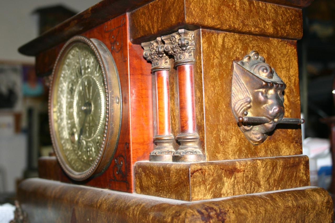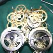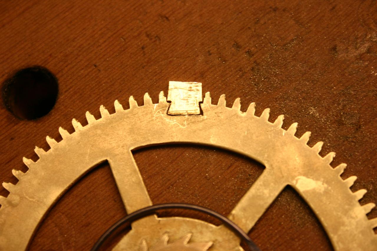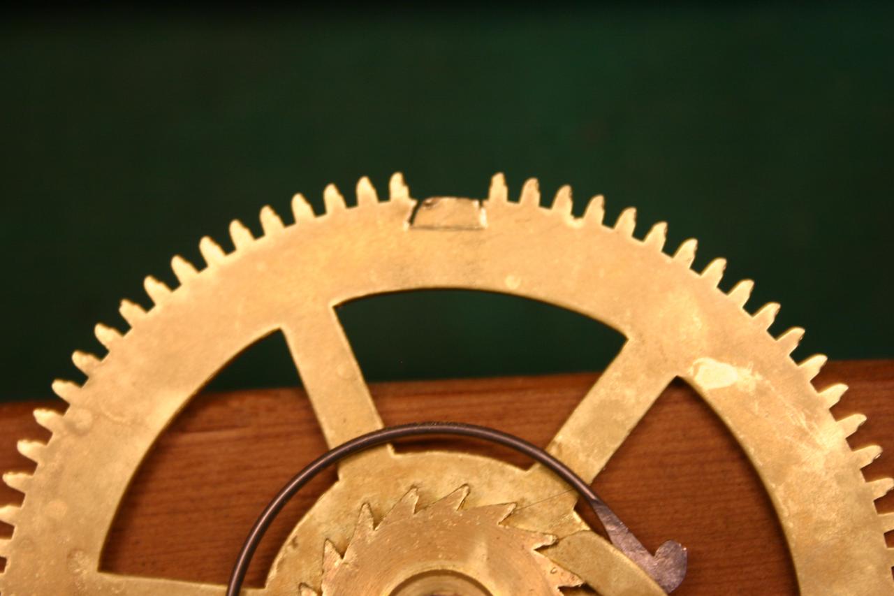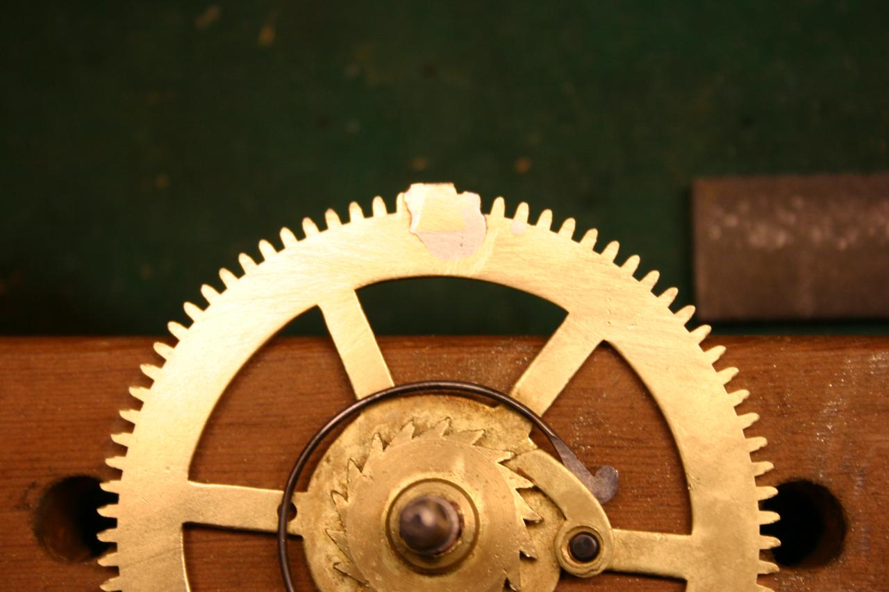 Lets go through a typical repair job. In this case we are working on a Seth Thomas mantle clock, manufactured in 1906. It came into our shop because it had stopped working and the owner didn't know why. We discovered that the gear on the main wheel of the time side train had broken teeth and that bushings were needed on some of the pivot holes. To see what we did, with an explanation of the repair process, click on the first picture, upper left hand corner, and when the image loads, click the advance icon and watch the slide show.