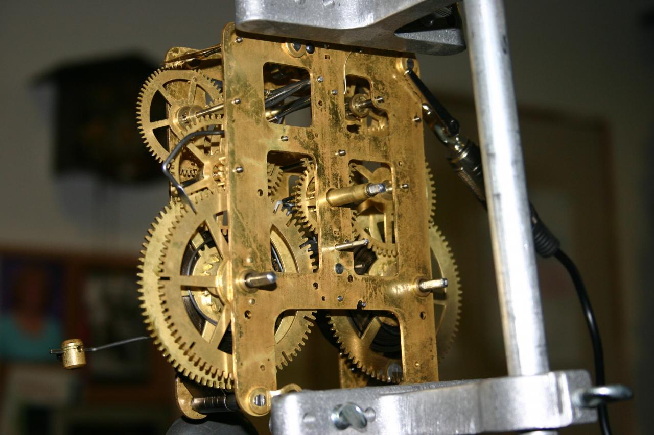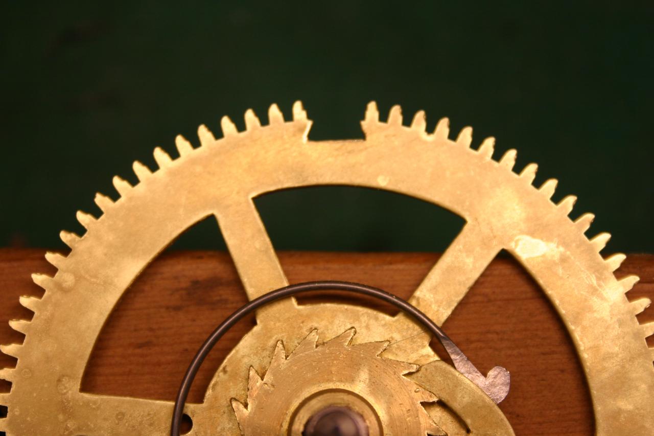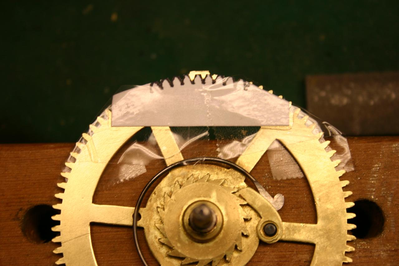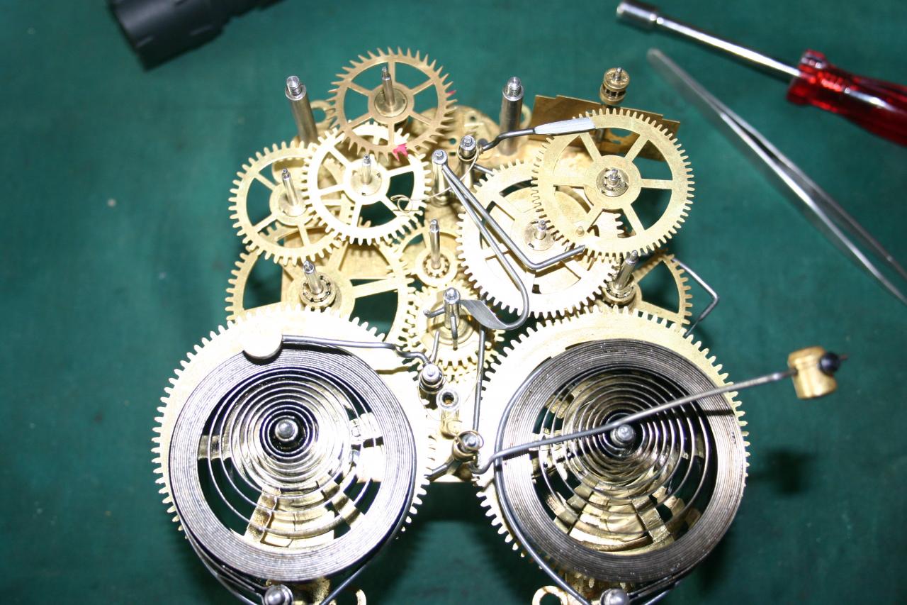 Lets go through a typical repair job. In this case we are working on a Seth Thomas mantle clock, manufactured in 1906. It came into our shop because it had stopped working and the owner didn't know why. We discovered that the gear on the main wheel of the time side train had broken teeth and that bushings were needed on some of the pivot holes. To see what we did, with an explanation of the repair process, click on the first picture, upper left hand corner, and when the image loads, click the advance icon and watch the slide show.